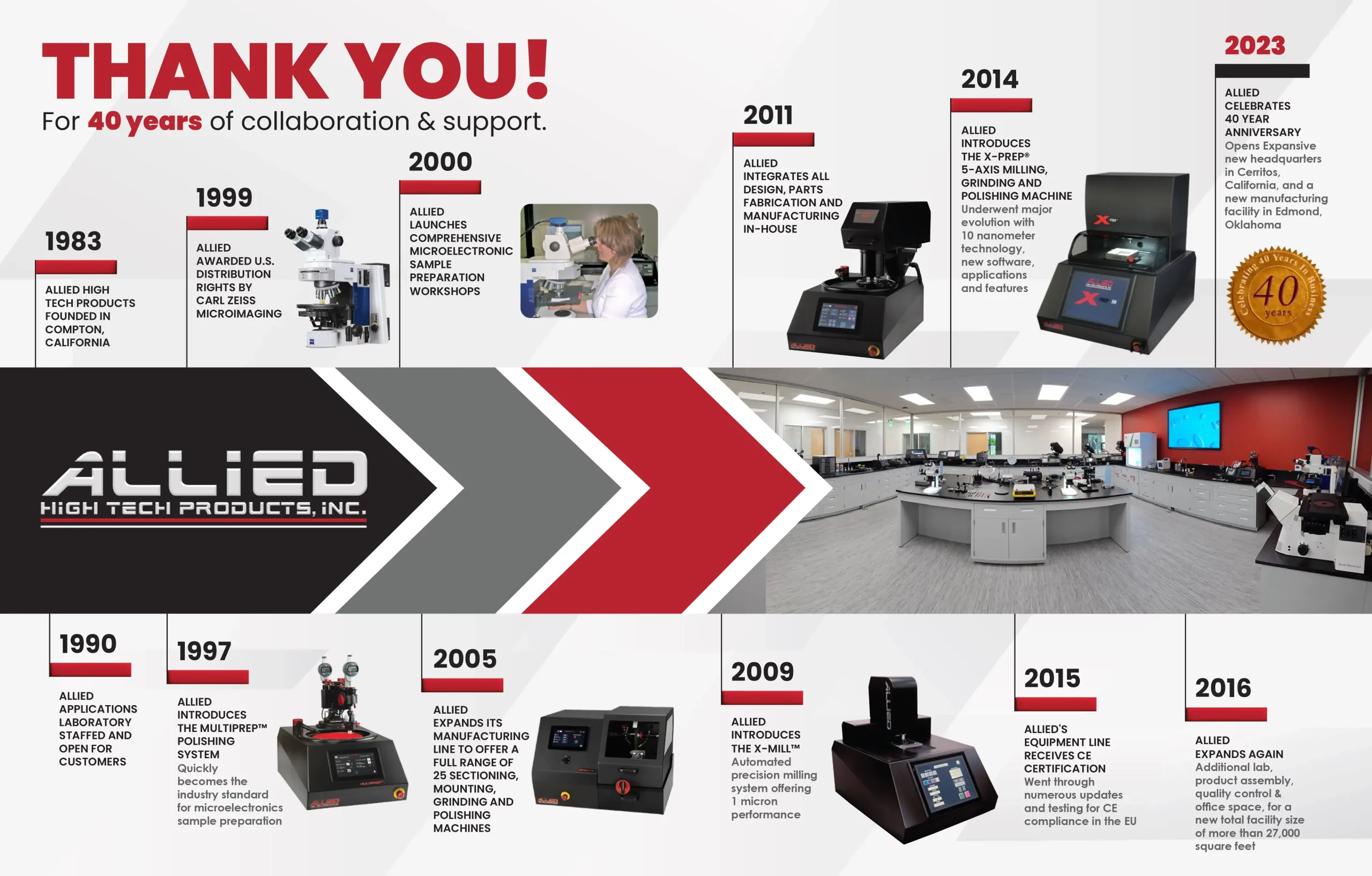 Over the years, Allied High Tech has become a leading provider of precision equipment and consumables for material analysis and sample preparation. Its diverse range of products includes precision sectioning machines, polishing machines, mounting presses, and image analysis software. These products are widely used in industries such as automotive, aerospace, electronics, and materials research.