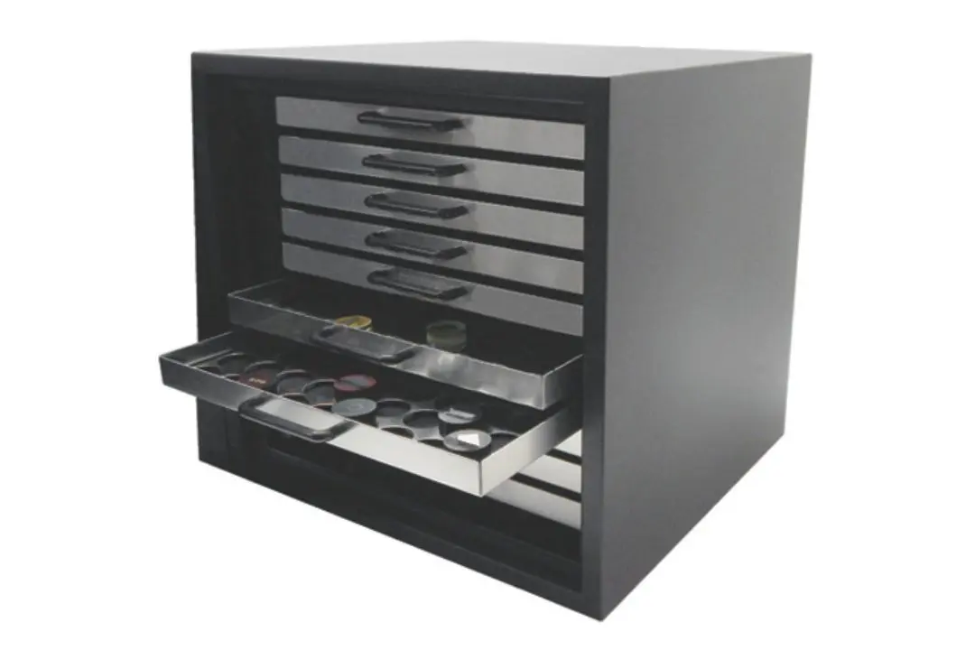 With a compact, stackable design, this ten-drawer capacity storage cabinet features a self-tightening door lock that is airtight and includes a rechargeable desiccant canister to minimize moisture.