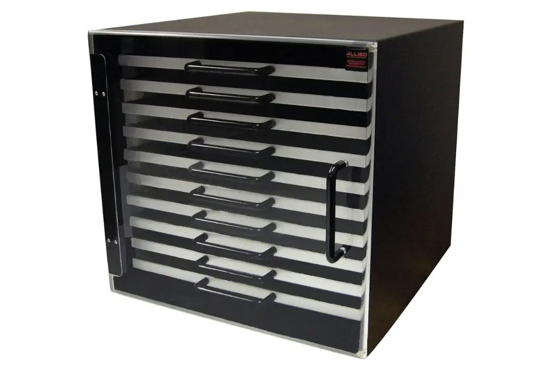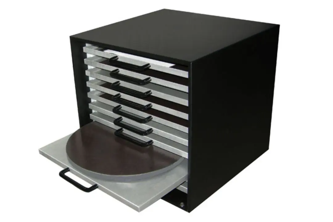 Durable aluminum cabinet designed to support organized storage of platens, discs, or cloths up to 12″ (305 mm) in diameter